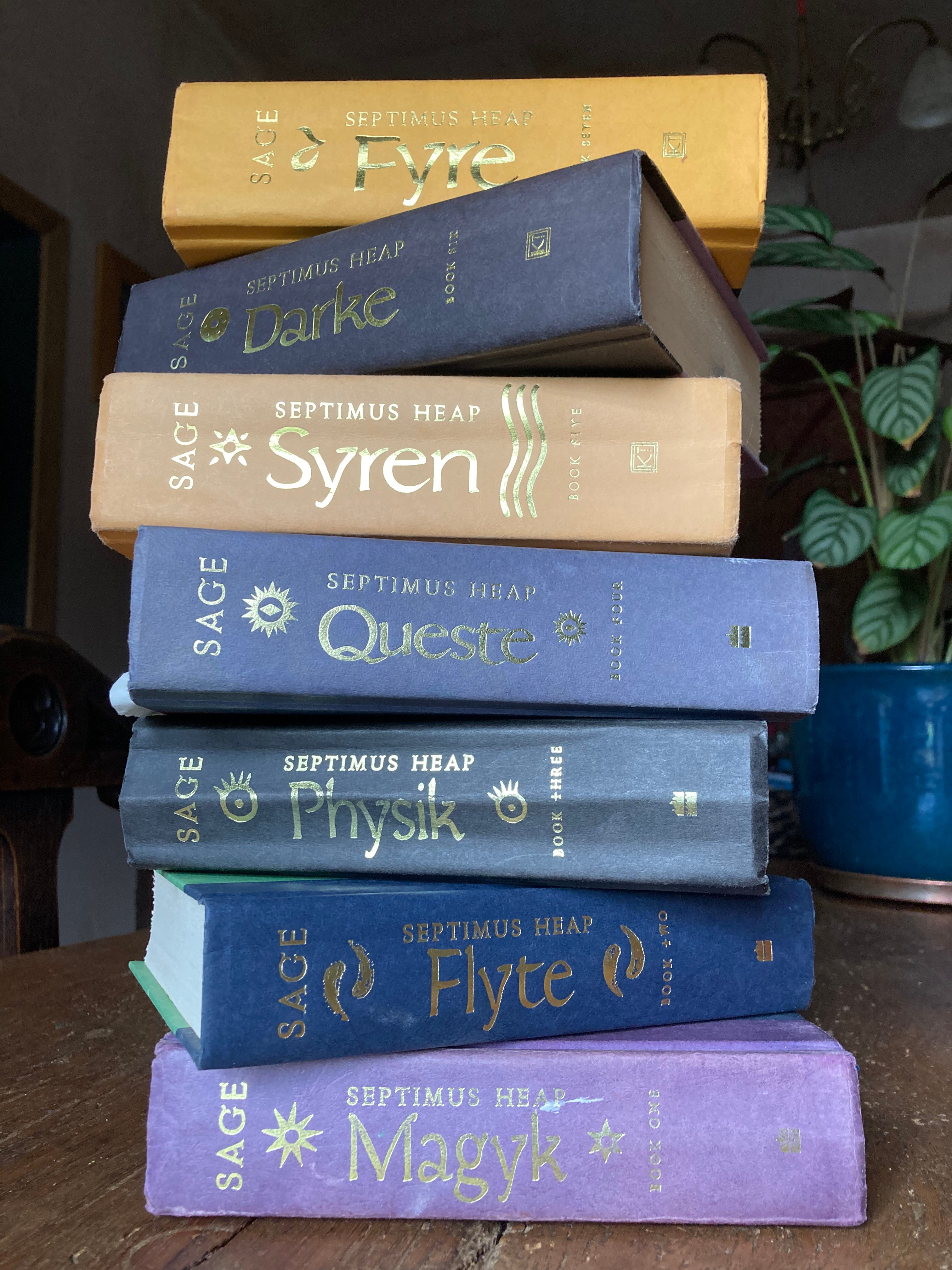 Every week I am going to take a random page from one of the seven Septimus Heap books and see where it takes us. I’ve got my fave set of books ready and waiting to go. Here they are below, the original USA edition without their covers. All much loved, battered and some of them have travelled around the USA with me on whirlwind-wonderful author tours. The covers by Mark Zug are breathtaking, iconic, but I also love the plain coloured boards that lurk beneath with their contrasting spines and the impressed symbol on them. Thank you, Katherine Tegen and HarperCollins US, for taking so much care with these books and making them so beautiful. What a Magykal time we all had creating them …